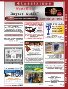 5 - 0 5 8 2 0 1 0 - 7 4 SIMCO 2400, 10” auger w/attachments, excellent condition........$18,000 OBO Call: 320-360-5523 130-988 Gus Pech Bucket / Boring Rigs Wanted Any condition! Buckets, tooling, etc. Call Jared Sisk 816-517-4532 240-385 SEMCO, INC. All-Hydraulic Hydrorench S112H in Stock 1-12” Four Rollers Breaks Pipe, Makes Pipe to Torque Specs 800-541-1562 238-135 WorldWide Buyers’ Guide™ Where deals are made every day.™ Call: 850-547-0102 WorldWide Buyers’ Guide™ 51 JULY 2023 120-120 QUICK CASH MONEY Paid for Drill Rigs, Pump Hoists, Mud Pumps, Drill Pipe, & Bits. RENE HENDON Tel: 281-260-0880 220-162 Call or E-mail for Quotes PO Box 1067 Archer City, Texas 76351 940-574-2238 office 940-733-4321 cell e-mail: usabit@usarockbit.com Visit our website: www.usarockbit.com 220-1279 New and rerun PDC & tri-cone bits for HDD, water well, and geothermal drilling. We can repair your PDC bits in house. 337-446-3230 jim@pilotholebit.com pilotholebit.com 220-919 Jerry’s Bit Service will meet your every drilling need. We service and sell tricone, PDCs, as well as hole openers. Rather rent a PDC? No problem. We got you covered! Our company will repair your PDC, regardless if it is a rental or purchase. Contact: Jerry Shoemaker Mobile: (940) 393-2394 jerryshoemaker54@yahoo.com 771 CR 3591 Paradise TX 76073 USA (940) 683-2874 Fax: (940) 683-2874 Jerry’s Bit Service Inc. 220-712 220-822 220-648 220-2125 Office: 580.628.3093 John Linton, President: 580.628.1605 Jimmy Linton, VP: 580.628.1619 Jay Foster: (sales) 580.628.7381 Find the Perfect Bit okbit.com