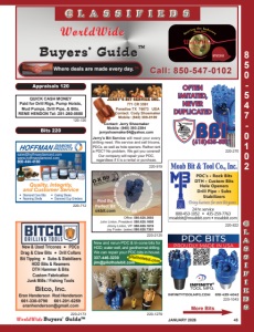 5 - 0 5 8 2 0 1 0 - 7 4 WorldWide Buyers’ Guide™ Where deals are made every day.™ Call: 850-547-0102 WorldWide Buyers’ Guide™ 45 JANUARY 2026 120-120 QUICK CASH MONEY Paid for Drill Rigs, Pump Hoists, Mud Pumps, Drill Pipe, & Bits. RENE HENDON Tel: 281-260-0880 220-1279 New and rerun PDC & tri-cone bits for HDD, water well, and geothermal drilling. We can repair your PDC bits in house. 337-446-3230 jim@pilotholebit.com pilotholebit.com 220-822 PDC’s • Rock Bits DTH • Custom Bits Hole Openers Drill Pipe • Subs Stabilizers More Bits 220-1043 220-270 220-2173 New & Used Tricones j PDCs Drag & Claw Bits j Drill Collars Bit Tipping j Subs & Stabilizers HDD Bits & Reamers DTH Hammer & Bits Custom Fabrication Junk Mills / Fishing Tools eranhenderson@gmail.com Rod Henderson 661-201-6259 Eran Henderson 661-330-0790 Bitco, Inc. 220-712 220-2125 Office: 580.628.3093 John Linton, President: 580.628.1605 Jimmy Linton, VP: 580.628.1619 Jay Foster: (sales) 580.628.7381 Find the Perfect Bit okbit.com 220-919 Jerry’s Bit Service will meet your every drilling need. We service and sell tricone, PDCs, as well as hole openers. Rather rent a PDC? No problem. We got you covered! Our company will repair your PDC, regardless if it is a rental or purchase. Contact: Jerry Shoemaker Mobile: (940) 393-2394 jerryshoemaker54@yahoo.com 771 CR 3591 Paradise TX 76073 USA Contact: Cody Shoemaker Mobile: (940) 389-8189 Jerry’s Bit Service Inc.